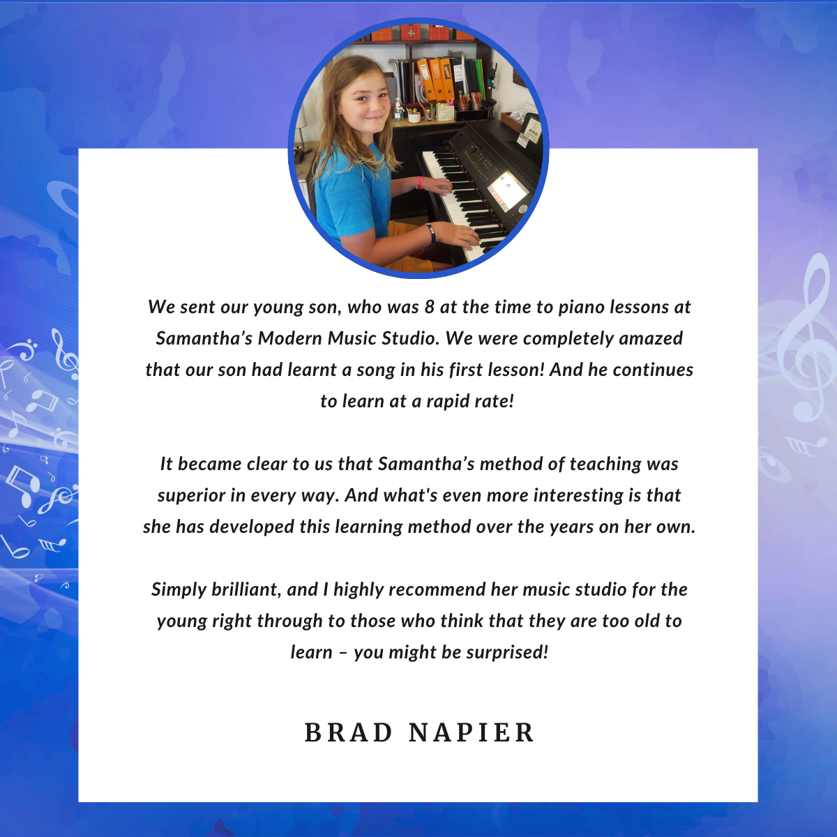 Children, teens, and adults alike have found that our approach makes learning simple, stress-free, and genuinely enjoyable. Many of our students had never touched a piano before, while others had tried and struggled with traditional methods — and all have been amazed at how quickly they could start making music.